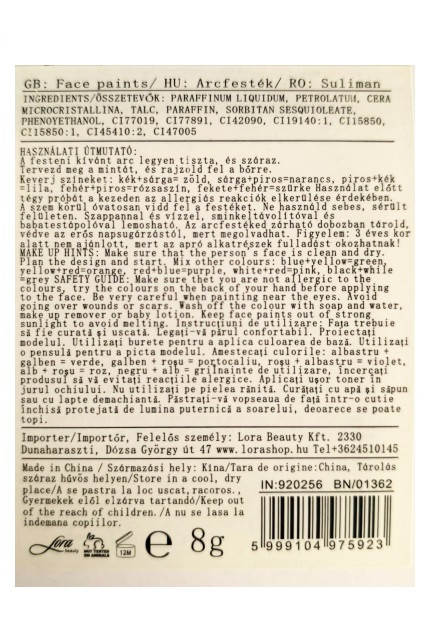 INGREDIENTS/ÖSSZETEVŐK: PARAFFINUM LIQUIDUM, PETROLATUM, CERA MICROCRISTALLINA, TALC, PARAFFIN, SORBITAN SESQUIOLEATE, PHENOYETHANOL, CI77019, CI77891, CI42090, CI19140:1, CI15850, CI15850:1, CI45410:2, CI47005